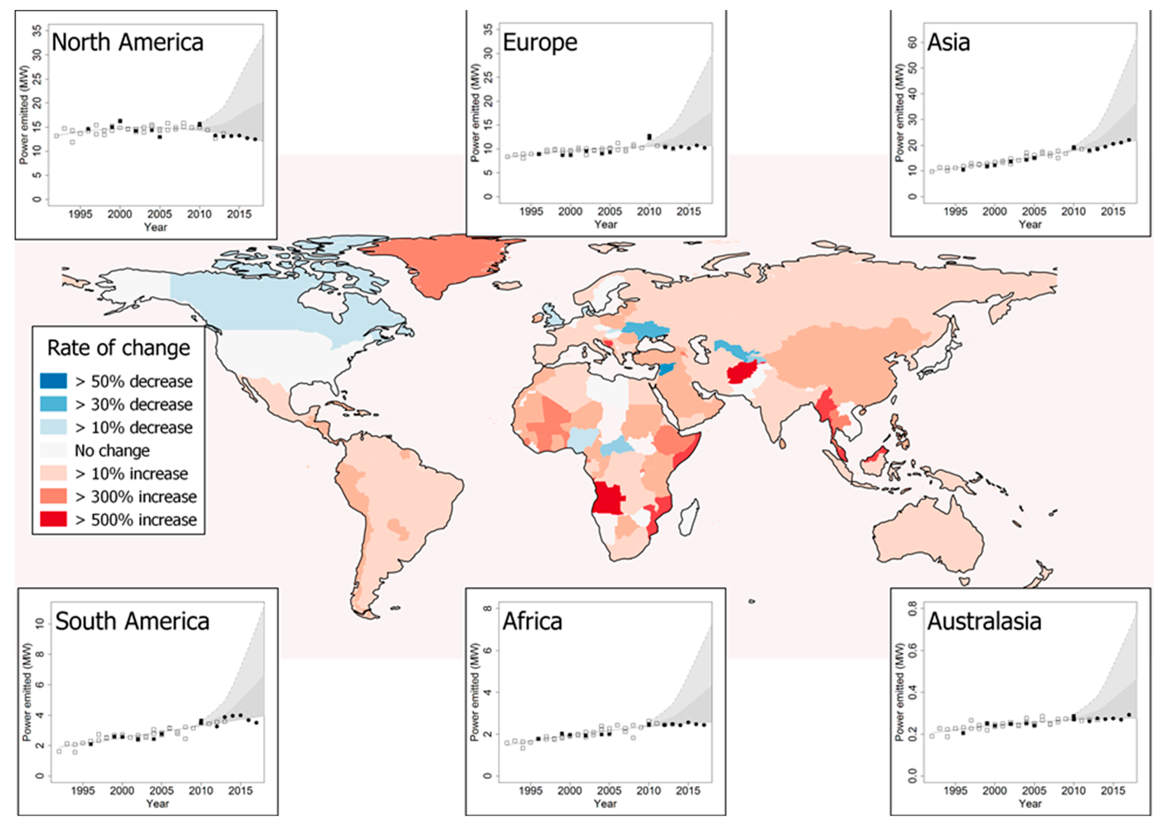 Grafika przedstawia tempo zmian sztucznego światła w nocy, wykrywalne przez satelity w latach 1992-2017. Na mapie pokazane są wyniki dla poszczególnych krajów, a na wykresach wstawkowych – dla kontynentów. Źródło: https://doi.org/10.3390/rs13163311