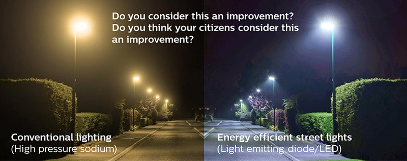 Po lewej mamy tradycyjne oprawy, po prawej oświetlenie LED. Pierwszą różnicą, która zauważamy na zdjęciu, jest kolor. Barwę światła mierzymy w Kelwinach. Po lewej stronie mamy ciepłe światło o temperaturze 2600 Kelwinów. Po prawej światło jest znacznie zimniejsze, o natężeniu około 5000 Kelwinów. Zimne, białe i niebieskie światło sprawia, że wszystko jest lepiej widoczne, ponieważ przypomina światło dzienne. Ma to swoje wady: zimne barwy światła LED (najczęściej stosowane) mają znacznie większy zasięg geograficzny, co powoduje, że większy obszar staje się zanieczyszczony światłem.