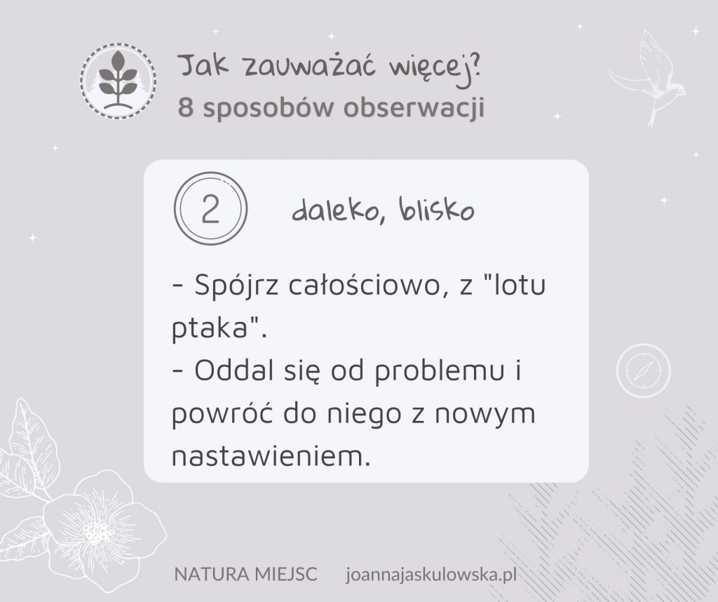 Metoda daleko — blisko pomaga odpocząć, złapać oddech, ostudzić myśli, wyplątać ciało z napięcia. Oddalając się i wracając, nawet jeśli przyjmiemy tę samą perspektywę, widzimy już trochę inaczej. Dystans to lekarstwo na znużenie, kiedy już nic nie widać oraz na wąskie, jednotorowe spojrzenie. Czasem wystarczy przerwa z filiżanką dobrej herbaty, a nawet długi, spokojny wdech i wydech. Warto również spojrzeć z „lotu ptaka”. Pozwala to zobaczyć całość, wzajemne powiązania, czy prawidłowości, które normalnie byłyby trudne do wychwycenia.